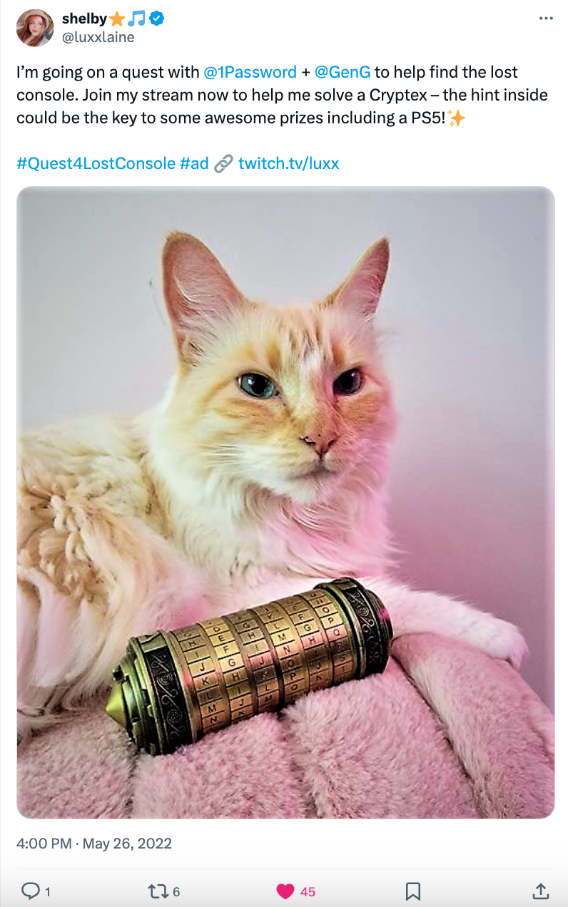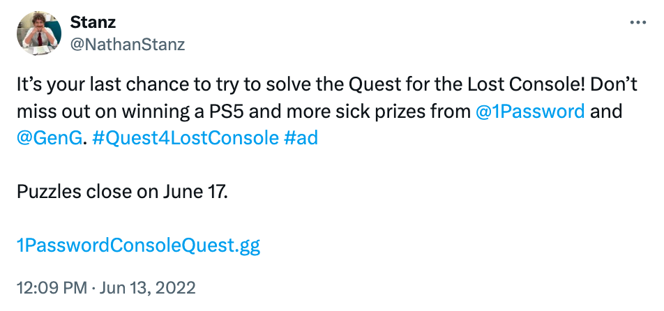 Top video game streamers including Stanz, Goofywise, and Luxx shared hints for each puzzle to help participants advance in the quest. In addition to this, we utilized all social channels, paid ads, affiliate publications, 1Password's podcast, PR, and numerous blogs to enhance the reach of this campaign.
